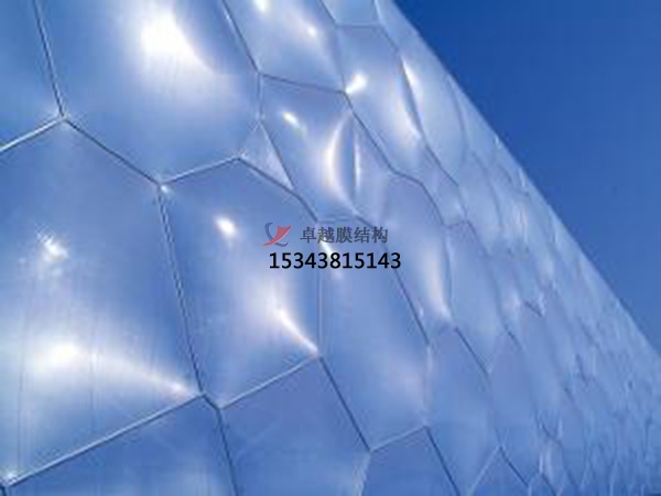 “ETFE"是英文Ethylene Tetra Fluoro Ethylene的縮寫,幅名稱為乙烯-四氟Z烯共聚物。ETFE膜結構膜材具有較高的抗拉強度、抗衝擊強度及抗撕裂能力。ETFE膜材的厚度通常在0.05 ~ 0.25mm。隨著厚度的增加,膜材的硬度將增加,同時也更脆,增大了加工難度。ETFE材料的典型用法是,將兩層或三層膜材“焊接"在一起,運送到工地。然後充氣使它們膨脹成氣枕。