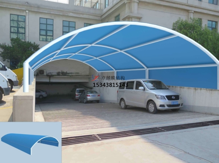 車庫出入口膜結構頂棚是一種現代化的建築結構,它采用高強度、耐久性的膜材料,通過鋼骨架、拉索、張力杆等構件,形成一種穩定的空間形態,用於車庫出入口的遮陽和防護。這種結構不僅具有良好的透光性和抗風能力,而且設計簡潔美觀,非常有現代感。