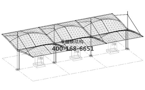 本工程膜材采用白色高端國產膜材PVDF高自潔環保建築膜材,鋼結構采用更好的標準Q235B鋼材,表麵采用酚醛底漆處理,麵漆采用白色鋼結構專用快幹磁漆。