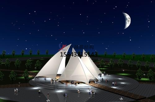 2.膜結構建築的整體藝術性強的特點:膜結構建築突破了傳統的建築結構類型,以造型學、色彩學為依托,可以結合每個現場的自然條件,充分發揮建築師的想象力,根據創意建造出傳統建築難以實現的曲線線條造型,使膜結構建築建築色彩豐富,富有時代氣息,可以完美的詮釋出結構的構件受力之美。夜晚在配合燈光易形成夜景,會給人以現代美的享受。