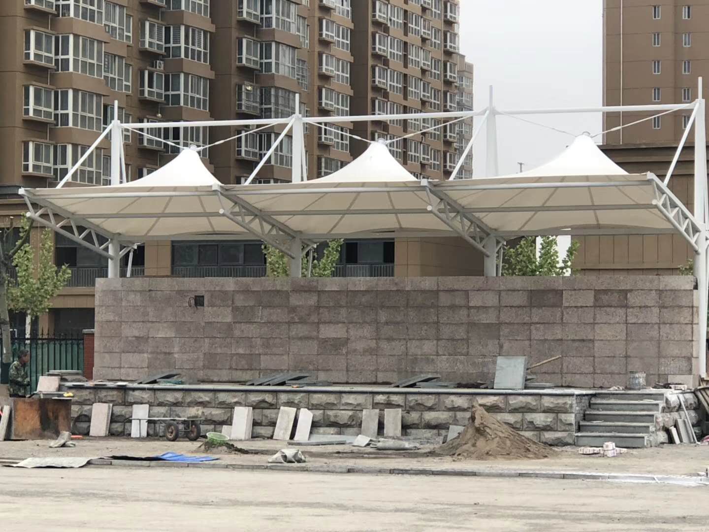工程結構形式:骨架式膜結構看台,自然排水。