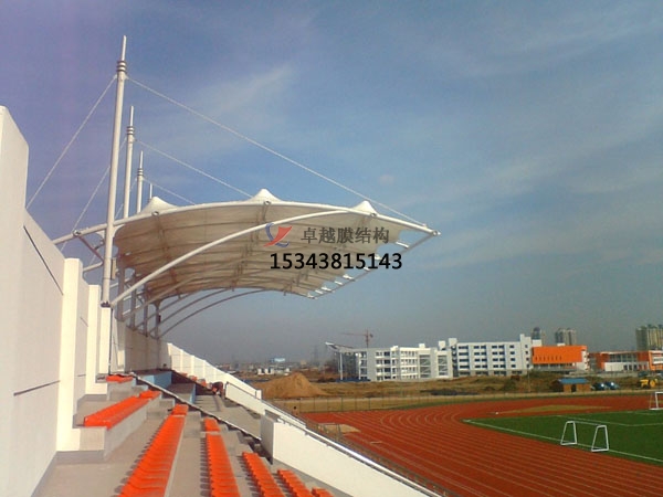大同衛校禦東新校工程建築麵積12.3萬m2 ,其體育場看台采用懸挑空間索膜結構,懸挑桁架長度為18.5m,桁架高度為9m,共分為25 個單元,第個和更後一個單元間距為3m,其餘為6m,膜體展開麵積為2824m2,膜用量為3284m2。整個建築前麵無立柱,形成開闊的空間,視野廣闊。