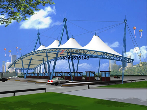 從客觀上來看,高速路收費站與其他收費站建築更大的不同就是在外形上擯除了單一的直線線條,增加了弧形線條,而這一弧形線條的實現得益於膜結構所采用的具有張拉性質的膜材料,PTFE膜材料是在極細的玻璃纖維編織成的基布上塗上PTFE(聚四氟乙烯)樹脂而形成的複合材料。