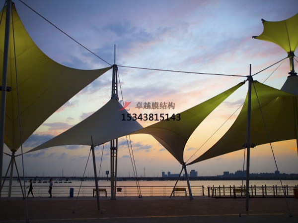 用於景觀膜結構遮陽棚中的高強度柔韌薄膜稱膜材,它是一種耐久用、高強度的塗層織物,由織物和塗層複合而成,具有質地柔韌、厚度小、重量輕、透光性好的特點。對自然光吸收和